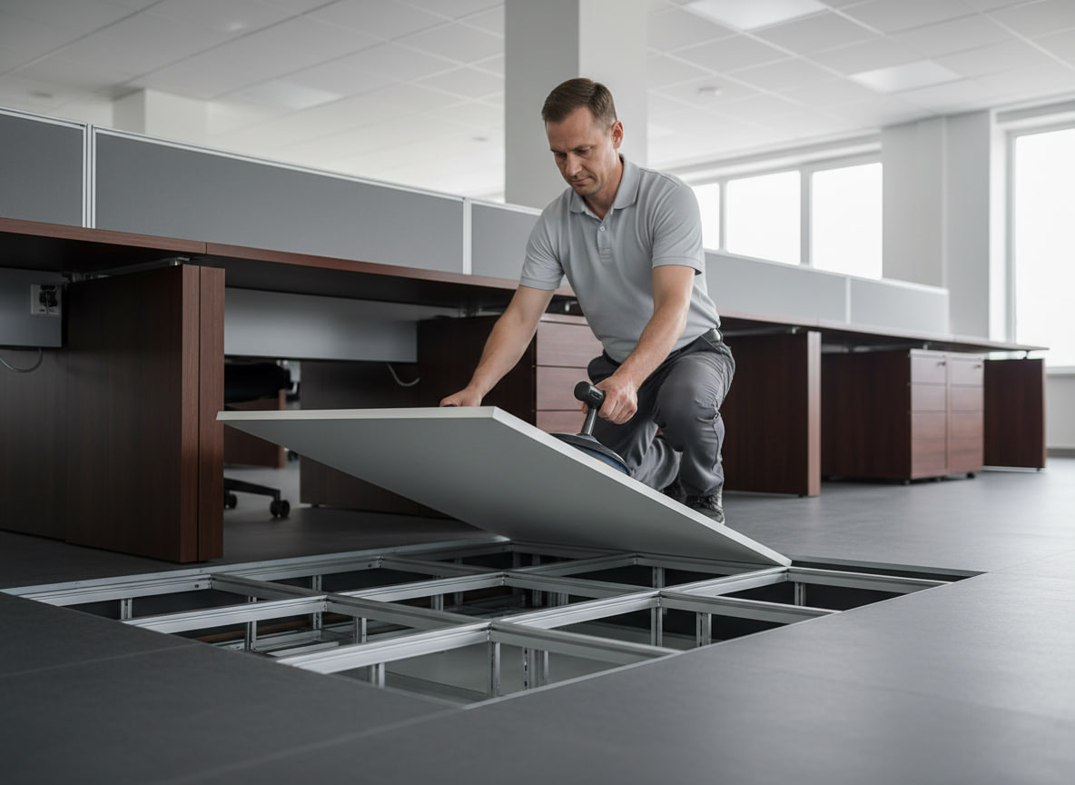 Панели фальшпола легко поднимаются, обеспечивая быстрый доступ к кабелям и электропроводке для их модернизации или ремонта. А при перепланировке помещения панели со съемными кассетами, в которых установлены розетки, быстро перемещаются, без нарушения целостности остальных участков пола.